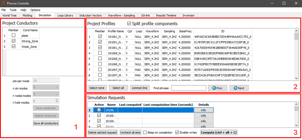 The "Project Profiles" container lists all data profiles that exist within the active Provus project. For each data profile the component, associated loop, transmitter waveform, sampling scheme and transmitter base frequency are listed in the adjacent columns. This container is where the user will select all data profiles that will be considered for the simulation request. The data profiles are added to the active simulation request by selecting the checkbox to the left of the "Profile Name" column.